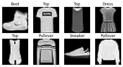 lbls = yb[:8]names = "Top Trouser Pullover Dress Coat Sandal Shirt Sneaker Bag Boot".split()